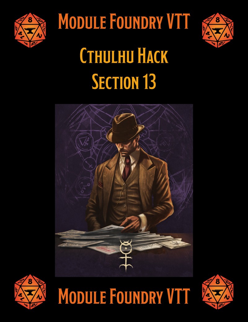 Ce module pour Foundry VTT contient la campagne du livre Section 13 (le contenu des deux scénarios additionnels Opérations spéciales est un autre module Foundry). Après avoir acheté le module, cliquez ici pour récupérer votre clé Foundry.